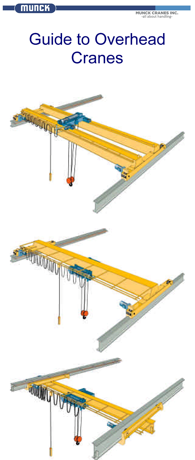 The Guide to Overhead Cranes is our most requested and downloaded resource, and even experienced team members here at Munck will reference this document as a source for valuable information. We are very proud to have helped so many companies over the years and we believe our Guide to Overhead Cranes is the first step in finding the right material handling solution for you.